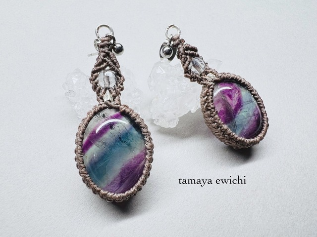 『ブルージョン』と呼ばれる 美しい縞目が見られるフローライトに メタルコーティングされて輝く水晶を合わせ 極小のカレンシルバーを添えて編み上げたピアス。 この美しい縞目を損なわないように 明るめのサンドベージュのワックスコードで 石を大きく見ていただけるようにフレーミングして ピアスにお創りしました。 1粒使いでネックレスに仕立ててもいいフローライトを 贅沢に2粒使ったピアス。 ピアスとして重さを感じない石をお選びしています。 ※イヤリングに変更可能です。 ご希望の場合には下記にてご選択ください。 ◆サイズ:約35mm ◆主な使用素材: フローライト/水晶/カレンシルバー(silver925) ワックスコード/ピアスパーツ他 ※天然の素材のを使用しておりますので インクルージョン(内包物)やクラック(細かいヒビ) などがございますことをご了承ください。 ※ご覧の環境により実物の色と異なる場合がございます。