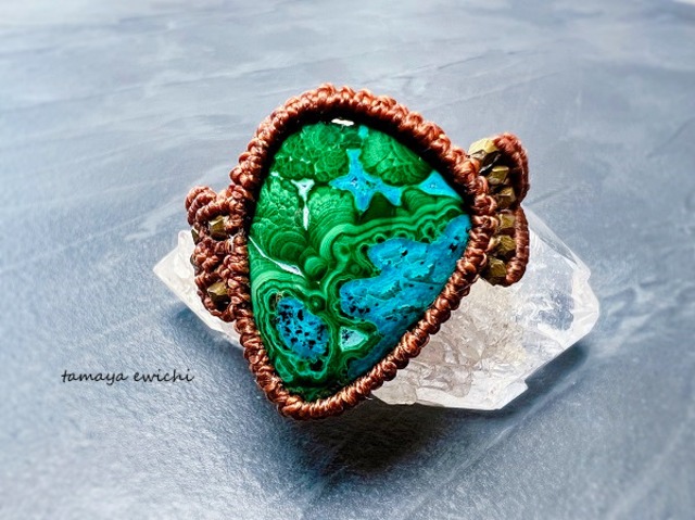 緑のマラカイトの縞目が美しいクリソコラを 大きなリングに仕立てました。 いつもならブレスレットやネックレスにする ビックサイズのクリソコラ。 いつも目に入る指先でその美しい景色をご堪能ください。 ⬛︎サイズ:16〜18号 ⬛︎主な使用素材:クリソコラ(クリソコラマラカイト)/メタルパーツ/ワックスコード ※天然の素材のを使用しておりますのでインクルージョン(内包物)やクラック(細かいヒビ)などがございますことをご了承ください。 ※ ご覧の環境により実物のお色と異なる場合がございます。