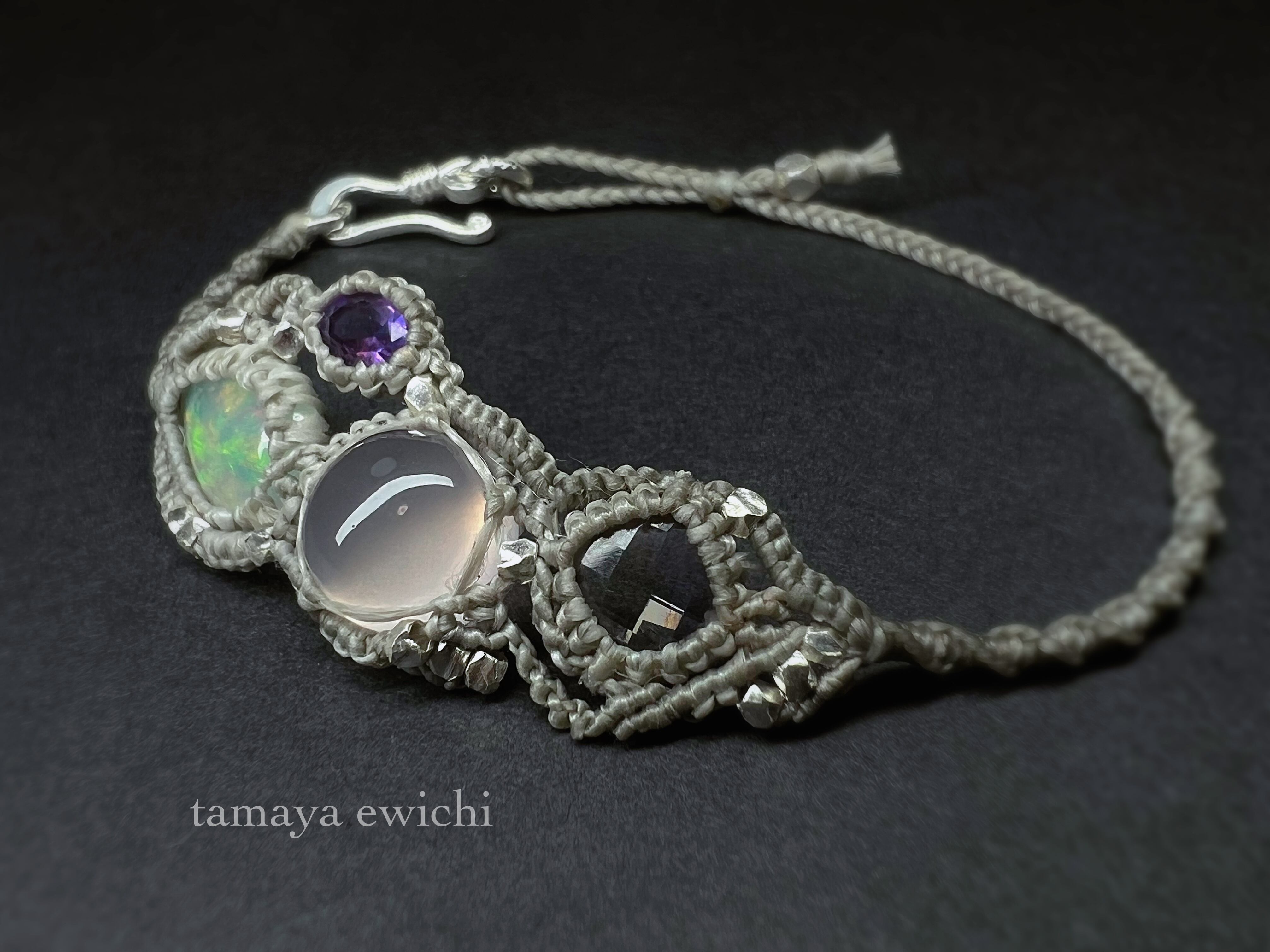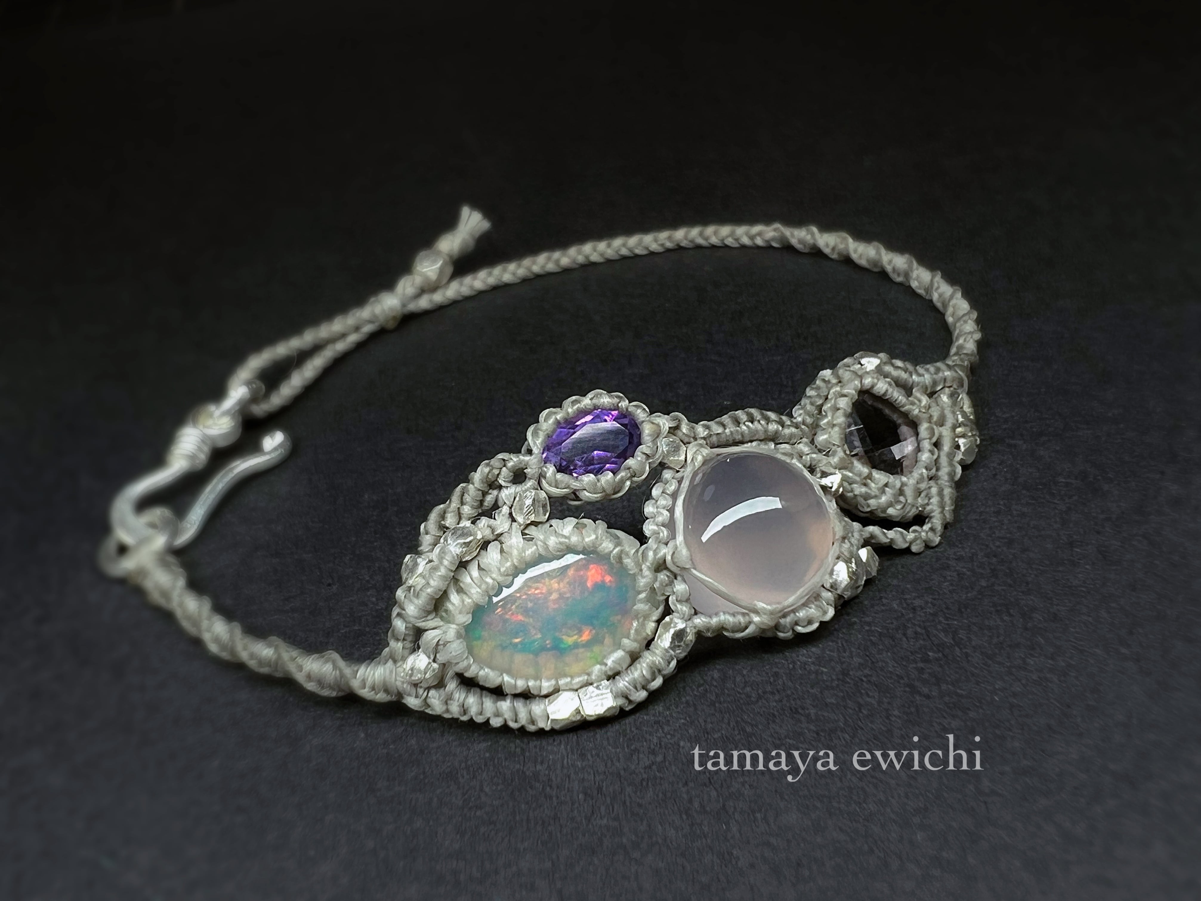 宝石質のエチオピアンオパール、ローズクォーツ、アメシスト、アメトリンを0.25mmのワックスコードで編み上げたブレスレット。