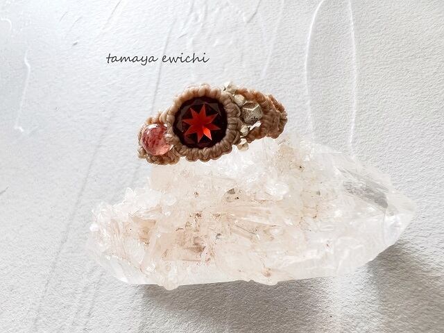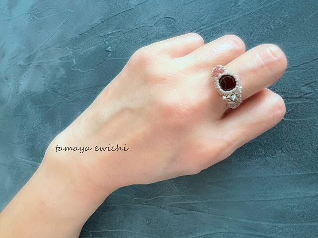 淡い赤色のモスコバイトを添えてリングをお創りしました。